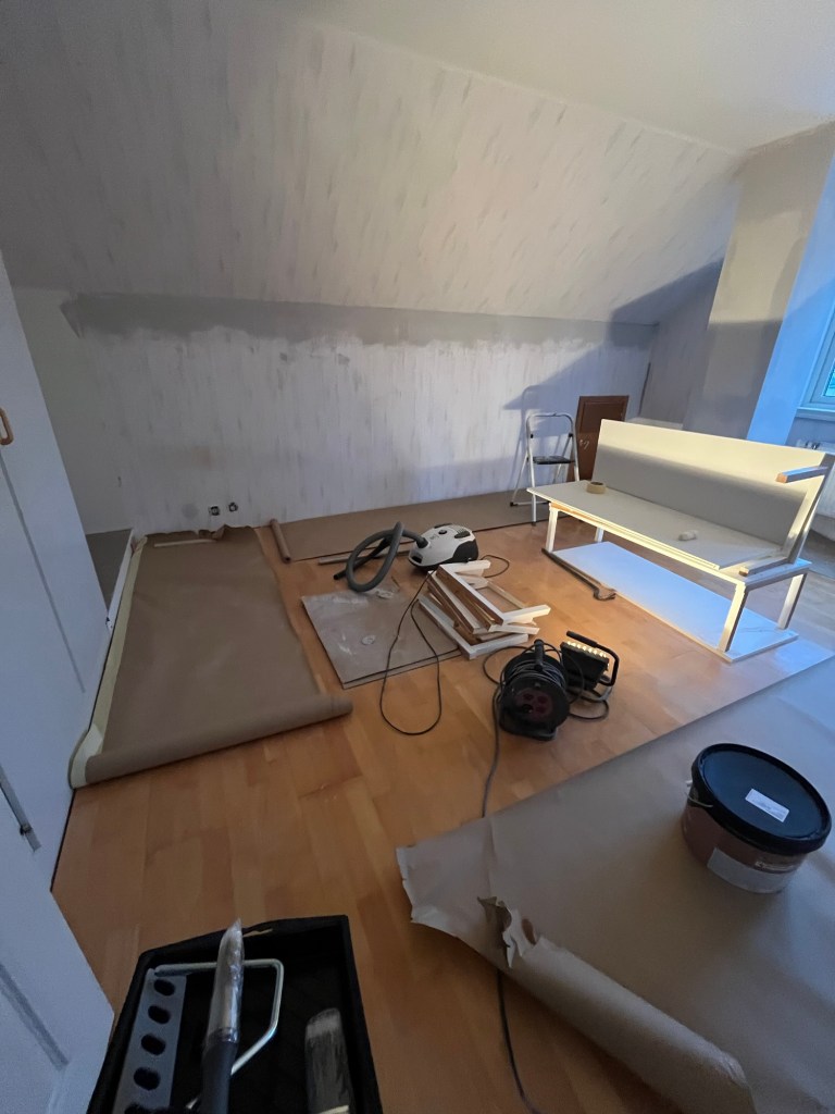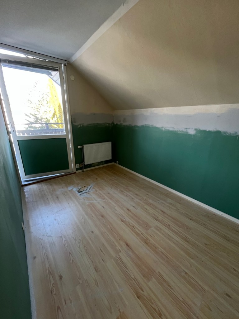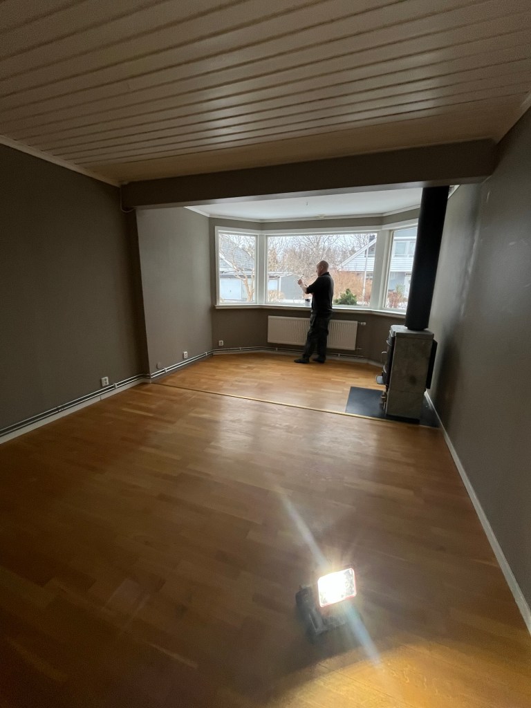 Och då börjar vardagsrummet ta sig. Vi har köpt en fåtölj och ett soffbord på Marketplace. Nu återstår en tv-bänk och någon skänk eller liknande.