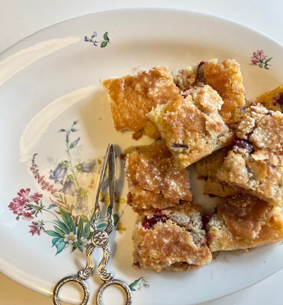 Jag har lyckats skörda några rabarber från min lilla planta så jag gjorde en rabarber-och hallonkaka. Blev dock inte så nöjd, tycker ugnen var lite ojämn i sitt gräddande.