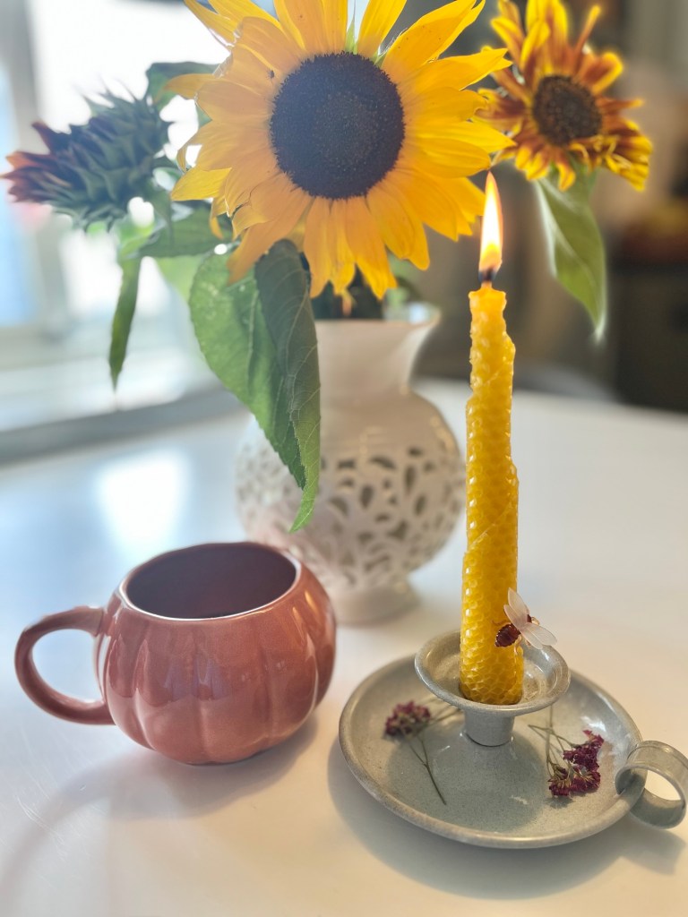 På vägen hem stannade vi till på Uljeberg. De har självplock av solrosor och så swishar man en slant till barncancerfonden. De fanns inte så många kvar men några fick jag tag i som passade fint till bivax-ljusen. Blev lite höstkänsla i köket.