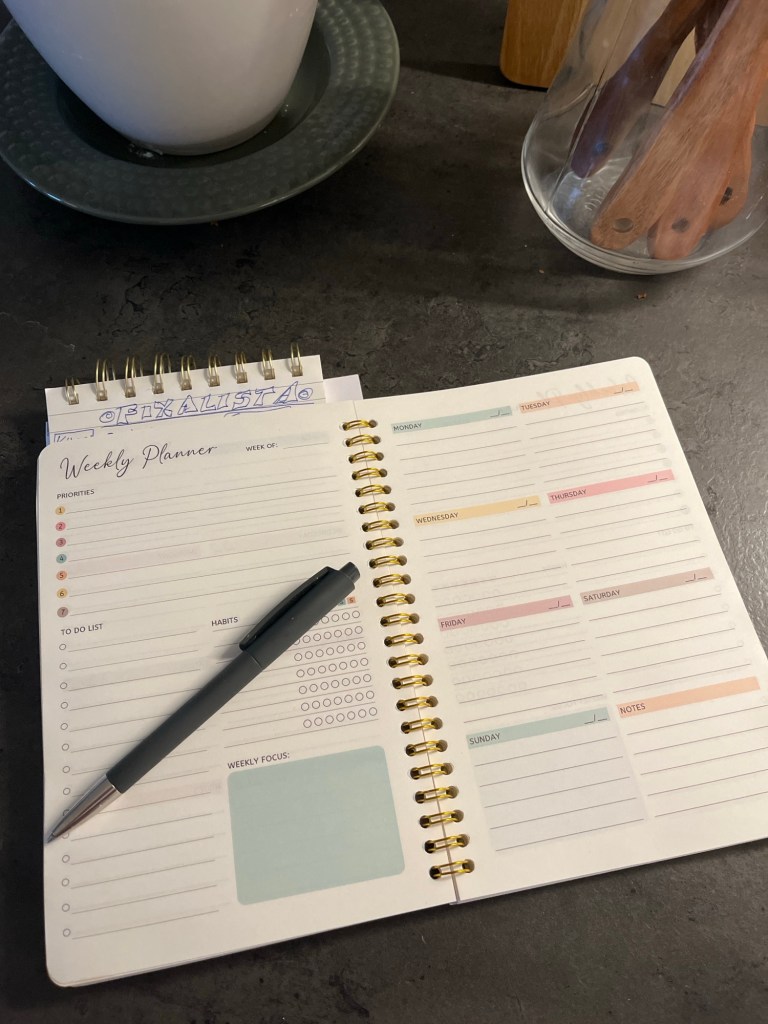 Veckoplanering Idag är det söndag och som varje söndag gör jag en veckoplanering. Sådana böcker/block finns överallt och jag justerar de sedan så de passar mig. Jag skulle aldrig vilja ha almanackan eller planeringen i telefonen.