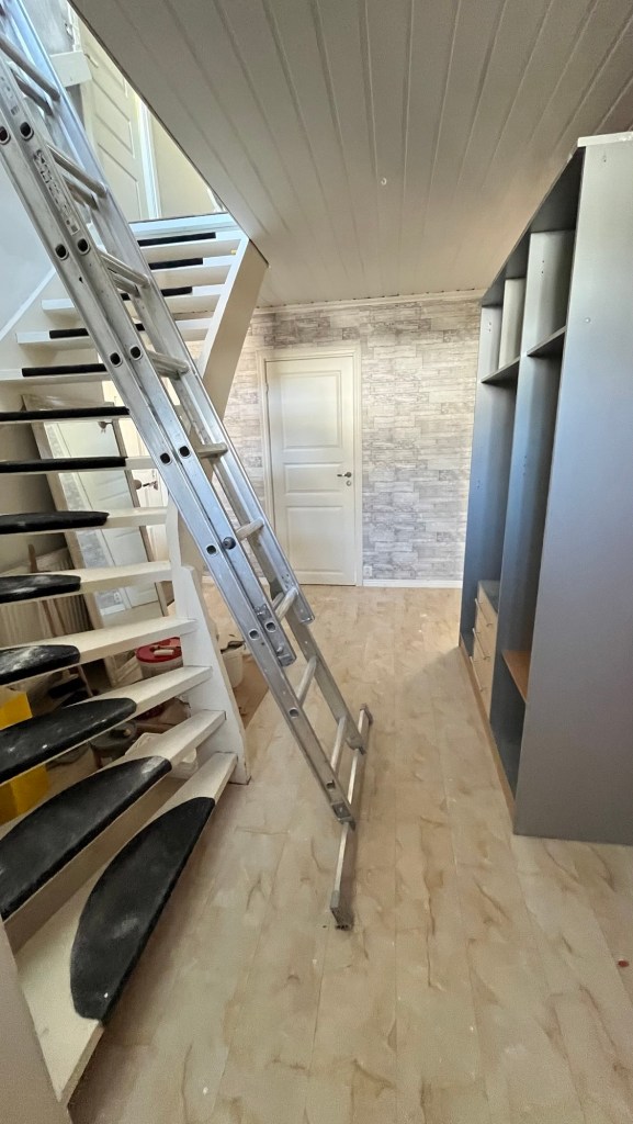 Hallrenoveringen går framåt. Väggarna upp i trappen samt hallen uppe är klara. Taket är klart. Vet inte riktigt vad som står på tur nu men antagligen kör vi hallen nere innan golvet uppe.