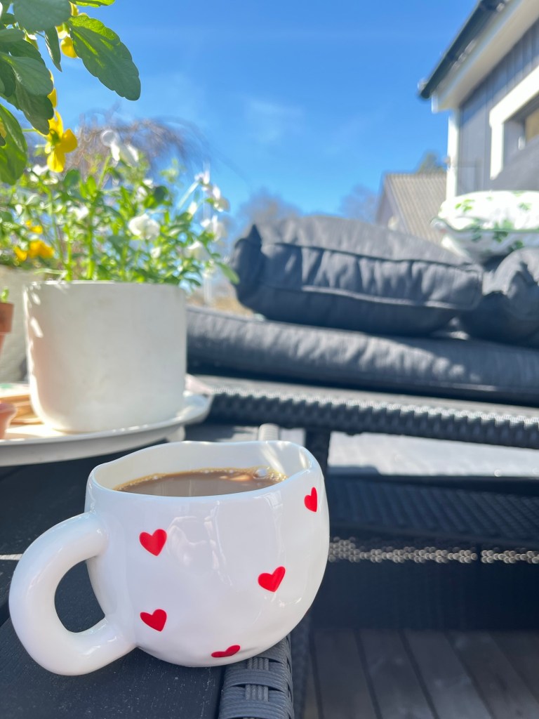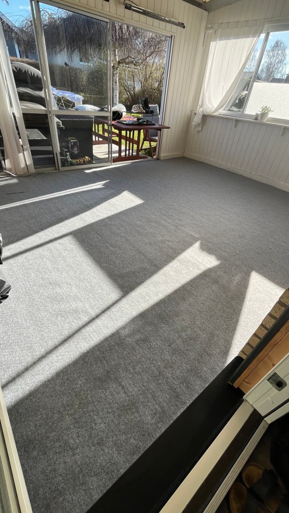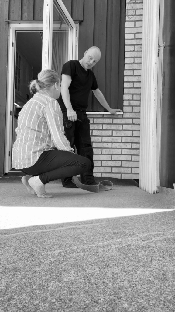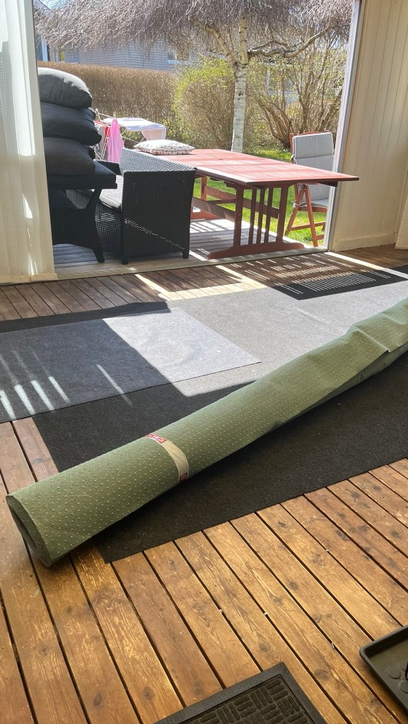 Att få mattan rak och bra var inte lika lätt så jag tog en kaffe i solen och tänkte över mitt val 🙃